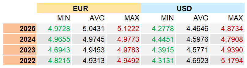 Pentru un scurt reminder, 2025 este anul în care euro a trecut peste pragul psihologic de 5 lei (pe 6 mai, ca să fiu exact), după ce a variat nesemnificativ în anii dinainte.