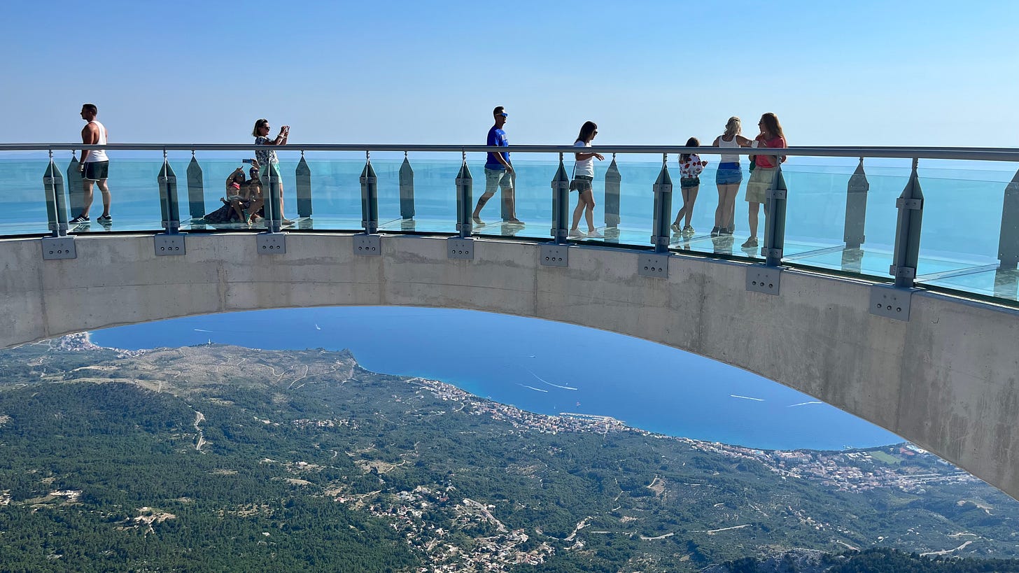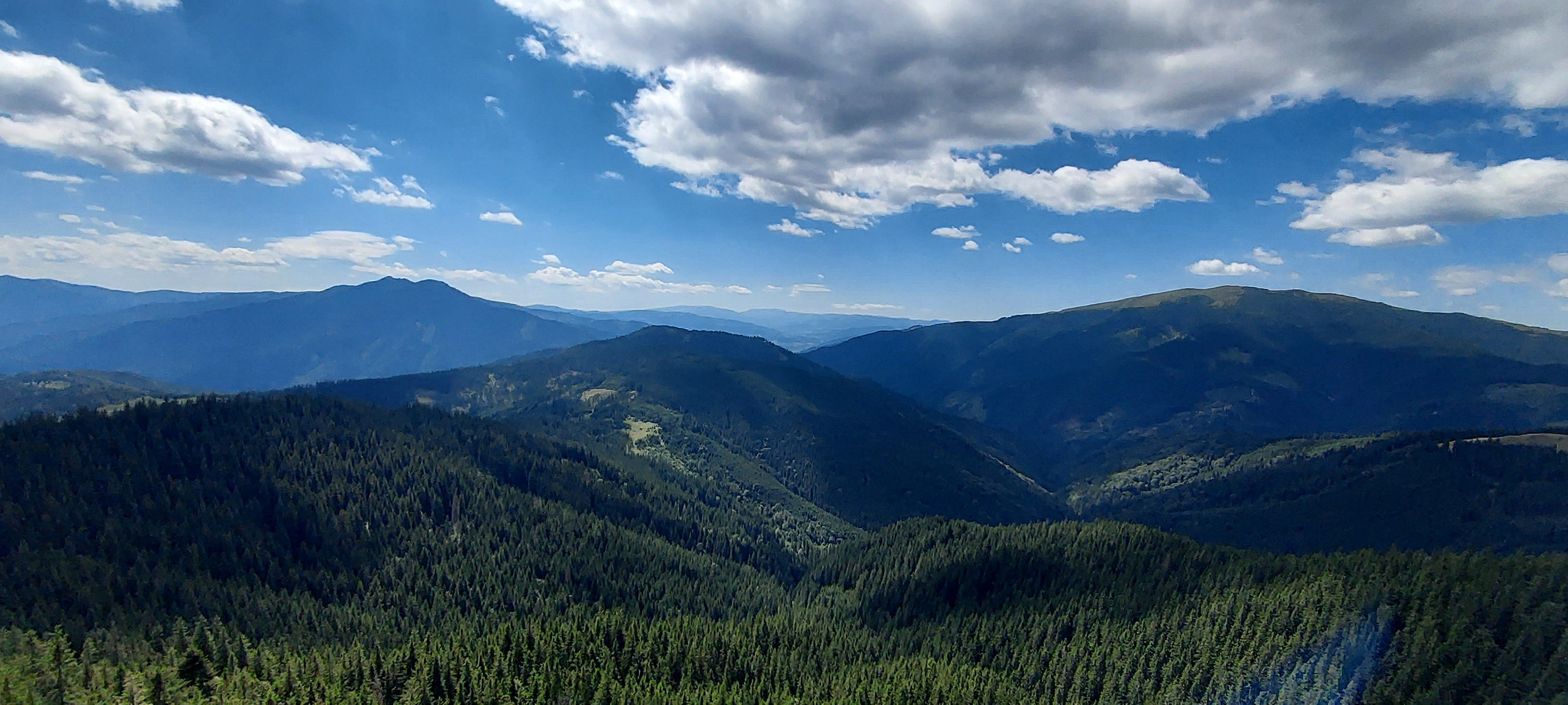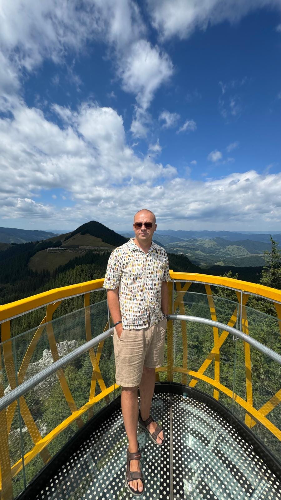 Mai sus, după urcușul pe un drum cu sens unic pe care-l respectă doar fraierii ce se încăpățânează să creadă în indicatoarele și regulile de circulație, Piatra Șoimului a fost decorată cu un balconaș panoramic, pompos numit Skywalk. Vederea la 180 de grade — asupra munților Rarău și Giumalău, la stânga, și a Obcinilor Bucovinei, la dreapta — este superbă, dar skywalk veritabil au alții, nu noi.