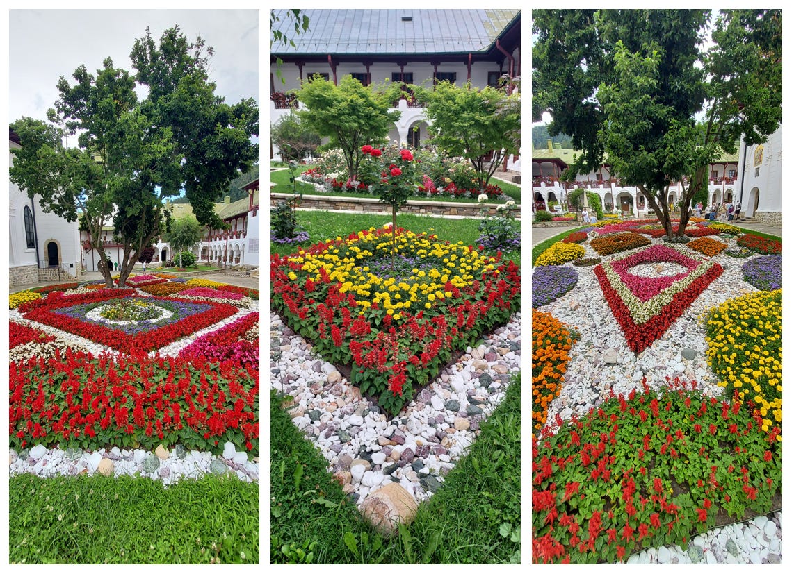 Celelalte obiective de pe traseu sunt mai liniştite. Cel mai mult mă impresionează Agapia, a cărei curte interioară este o bijuterie de design, cu splendide grădini construite din flori şi pietre. Eu şi S. – loviţi de patima pietrelor în Grecia şi de cea a fotografiilor cu flori şi gâze la Lacul Roşu – nu mai ştim ce să pozăm. Telefonul puştiului s-a transformat într-un veritabil rozariu digital şi mă bucur nespus când îl văd alergând de colo-colo, căutând trandafirii cei mai coloraţi şi unghiurile cele mai potrivite. Sunt momente în care el controlează telefonul, nu invers.