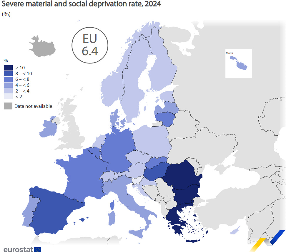 Iar ca să închei tot cu o statistică, peste 17% dintre români au suferit privațiuni materiale și sociale în 2024, spune Eurostat.