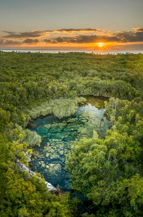 Aflată în sudul Mexicului de astăzi, Peninsula Yucatan este, aproape toată, o formaţiune de calcar poros. O bucată uriaşă de şvaiţer, cândva scufundată sub apă şi parte a unui sistem de recife de corali. Apoi un asteroid s-a prăvălit din cer, a deranjat plăcile tectonice şi a aruncat la suprafaţă stâncăria. De-atunci, timp de 65 de milioane de ani, ploaia şi apa mării şi-au săpat drum prin piatra moale, formând o reţea de canale acvifere la doar câţiva metri în subteran. Şi cum pământul se surpă des în Yucatan, aceste acvifere devin vizibile sub forma unor bazine naturale – sau cenote, de la cuvântul mayaş ts’ono’ot, ce înseamnă “groapă umplută cu apă”. Pentru istoricul geologic inedit şi frumuseţea uneori nepământeană, zona a fost propusă în 2012 pe lista World Unesco Heritage.