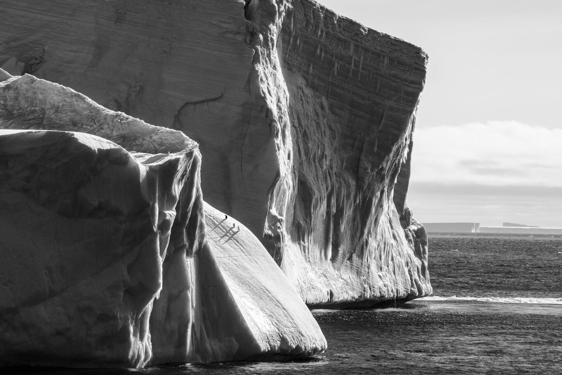 Siluetele pitice a trei pinguini pe fundalul unui iceberg din Marea Weddell, Antarctica.