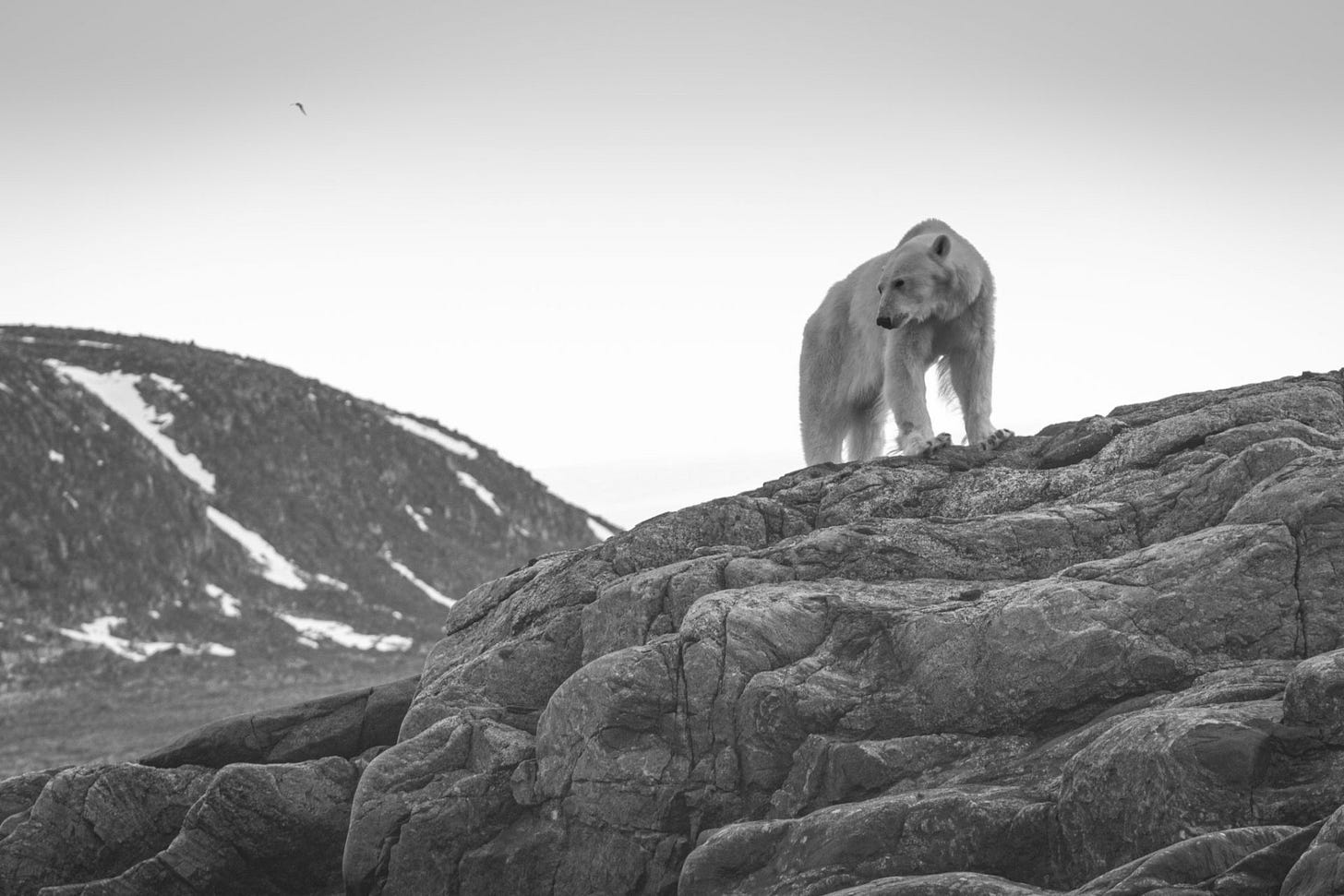 Un alt urs polar, slăbit de foametea îndurată pe un ţărm stâncos din Svalbard (Norvegia), unde a rămas blocat din cauza topirii accelerate a gheţurilor, după o vară neaşteptat de călduroasă.