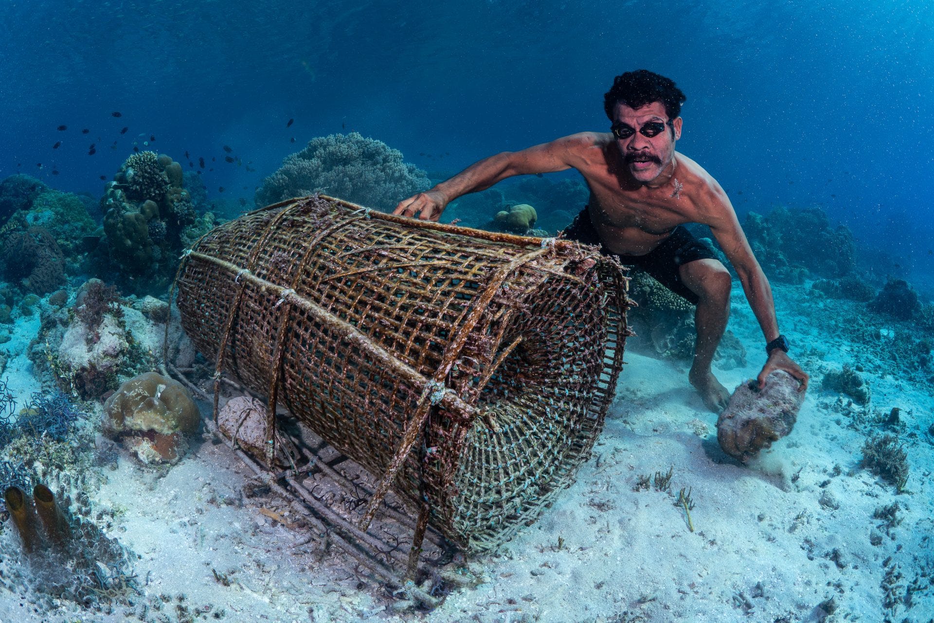 Pescuit tradiţional, cu coşuri bubu lucrate manual din bambus sau ratan, în Nusa Tenggara, Indonezia.